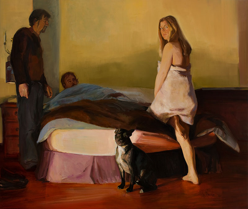 The artist adeptly captures the space within each room, her restless brush giving the pillows, drapery, and the air that surrounds them as much attention as the figures which populate these works. Yet the real strength of these paintings is not in their convincing rendition of space, light and anatomical accuracy, though these things are handled well. It is in their expression of the small stories which take place in every life, every day. They are distinctly un-monumental – and successfully blend gravity and poignancy without any trace of saccharine sentiment.