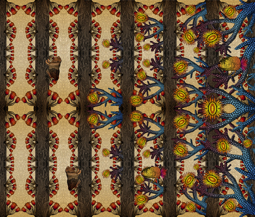The most impressive piece in the exhibition is informed by another 18th century European tradition. Outside – In is a 48 panelled work constructed to wallpaper part of the gallery. It is astounding in its complexity, its fusion of bold, electric colour with the most delicate detail, and the sheer technical prowess required in its printing and cohesion as a whole. Inspired by French scenic wallpapers produced in the 18th century by companies such as Zuber, Miljoevic consciously brings an exterior realm to an interior space. Zuber wallpaper often featured idealised images of exotic locations that bore little resemblance to reality – perfect for consumption in a non-threatening domestic setting. Similarly Milojevic has invented a beautiful fiction where coral and fishlike creations encroach on tree/land based forms signifying the meeting, and perhaps collision of different worlds.