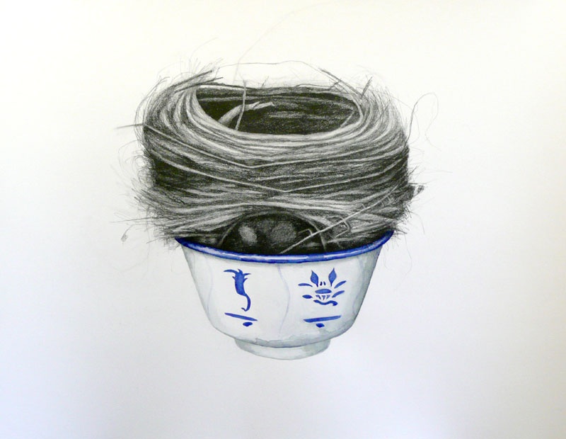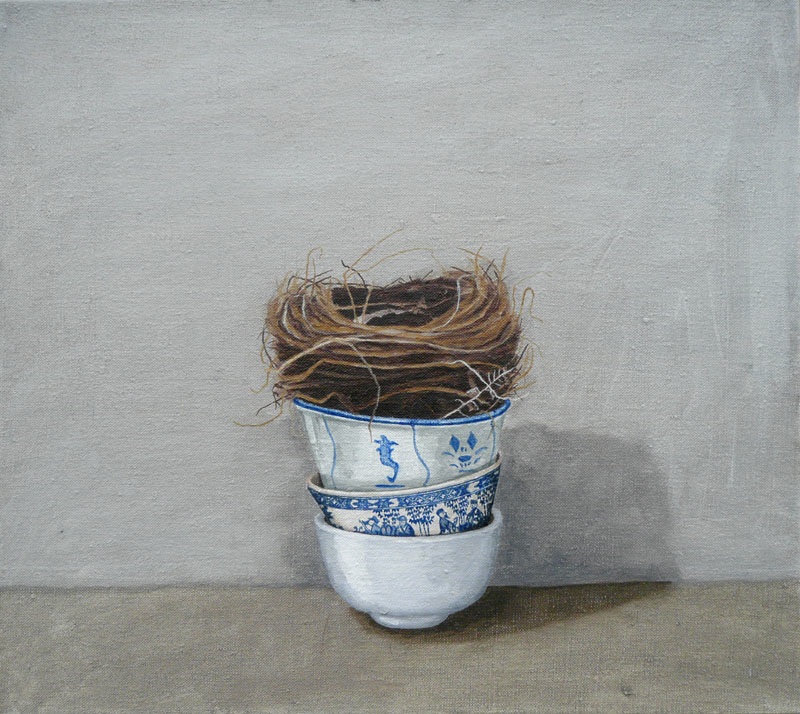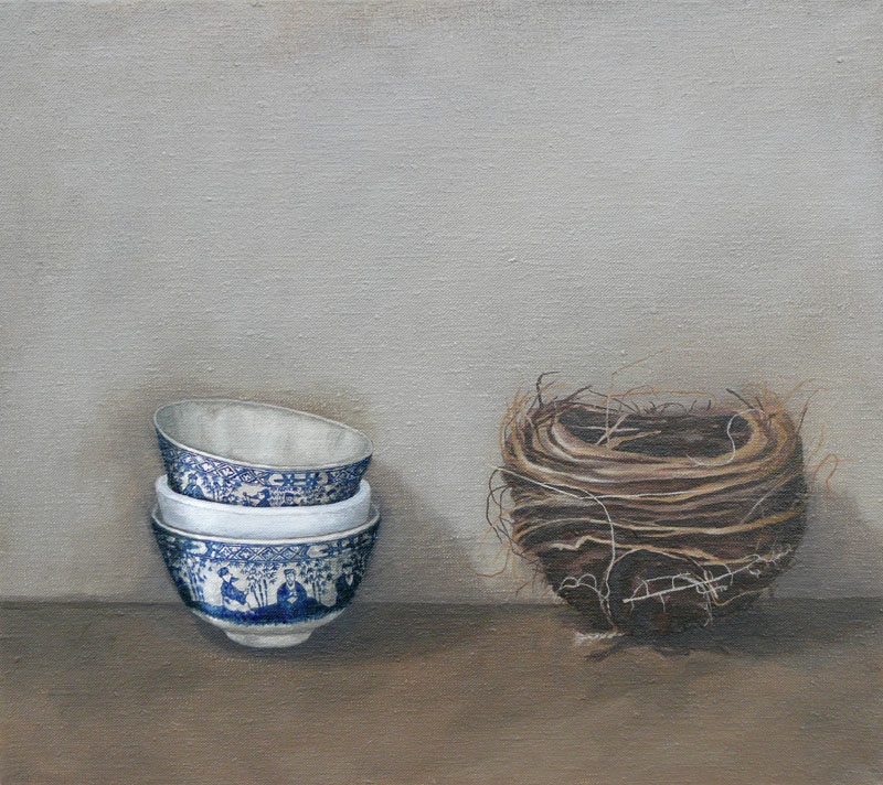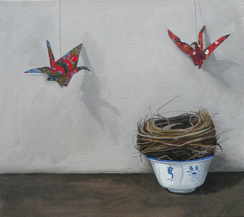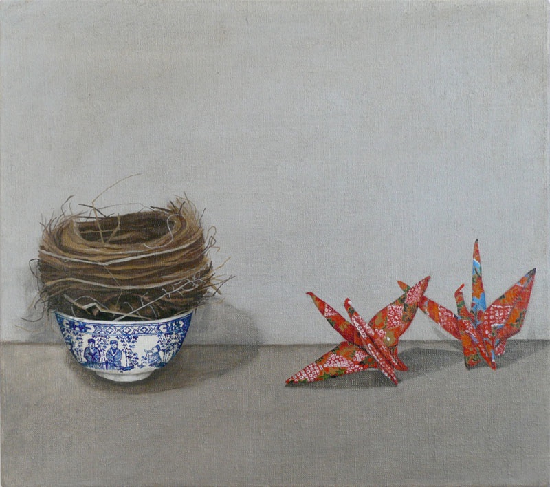 Focusing on the depiction of nests, bowls and origami paper cranes, these unlikely objects sit harmoniously in the picture plane. The idea for this series sprung very naturally from watching the small birds that make their home in the shrubs underneath the artist’s studio window. Gray waited patiently until their eggs had hatched and the proverbial nest was empty, before taking it into the studio. Fascinated by the aesthetic qualities of nests, their fragile and seemingly chaotic construction which belie strength and perfect functionality, these nests soon consumed her work. Perhaps it was also the metaphorical reading of these objects that the artist sought to harness. There is a sense of absence in Gray’s nests. While they used to nurture life, here they are rendered empty. This is enhanced by their juxtaposition with small empty bowls. While these two objects mirror each other in their overall shape, they are visually quite opposite. The smooth round, glossy surface of the bowls, painted with intricate ornamental scenes verses the natural random, roughness of the nests. It is this push-pull of textures that is reflected in her paintwork, which ranges from tightly detailed description, to looser brushier strokes.
