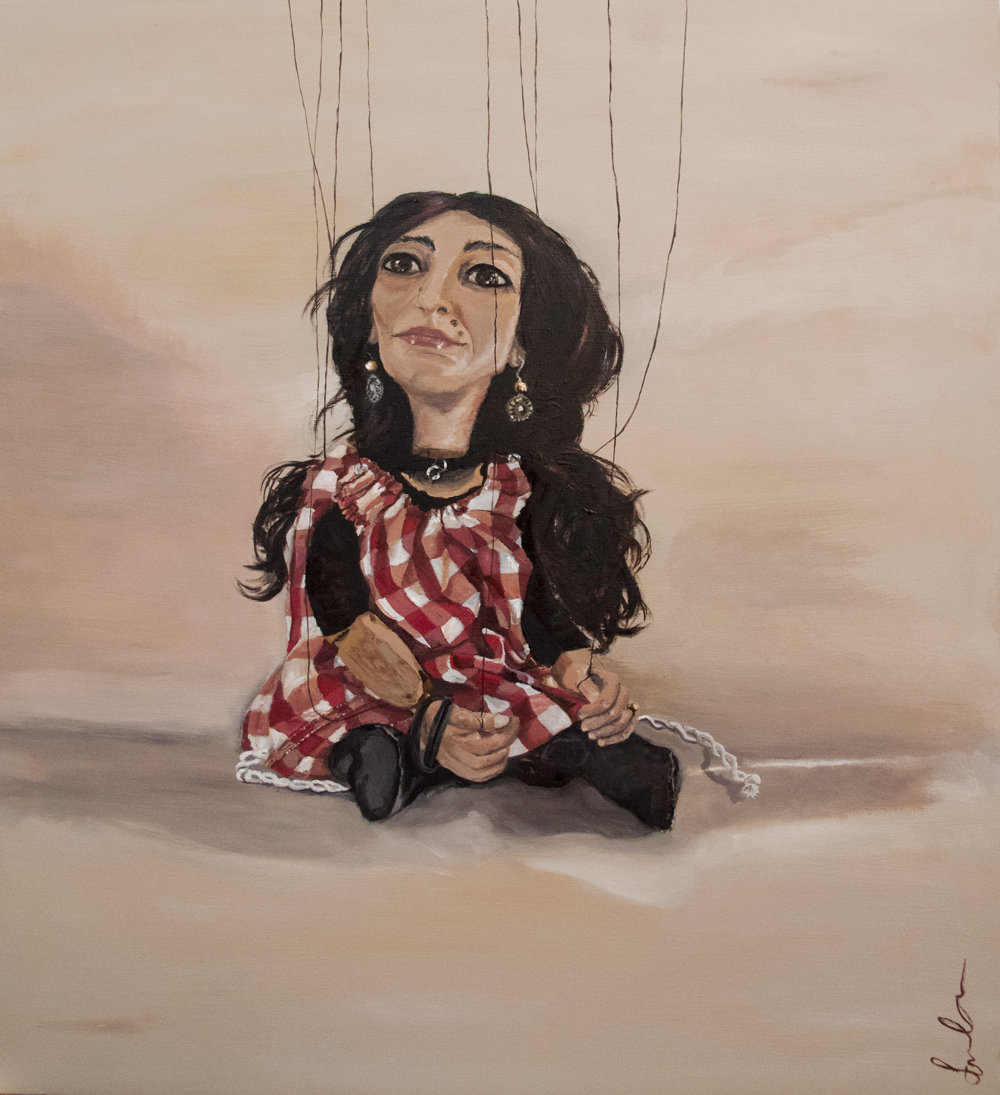 To convey the loss of control over her physical being that has been presented by Pudendal Neuralgia, the artist commissioned a marionette in her own likeness by marionette maker Colleen Burke. The result is an exquisitely crafted and hauntingly realistic version of herself in doll-like form. Soula paints, draws and collages representations of the marionette at various points throughout the book.