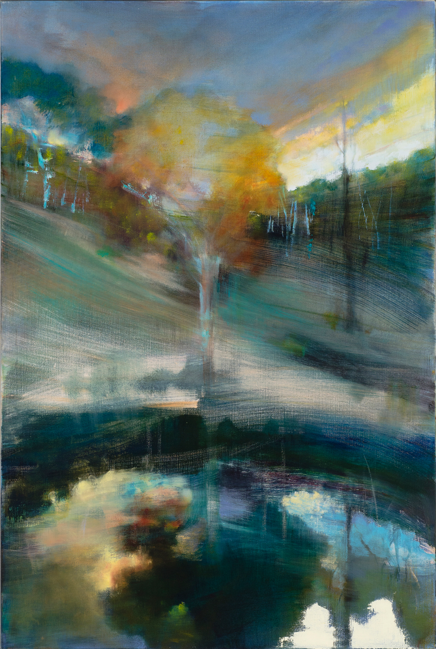 Baird’s practice often involves working outdoors, en plein air observing the changes in light and atmosphere and how these can vastly affect the appearance of a chosen spot. Some of her larger works take in a pond and its reflections at Tamboroora, an old mining outpost in the vicinity of Hill End. Here she captures the flood of light that occurs at day’s end, and channels the transformative power of light to shift the ordinary to the extraordinary. These large works have an otherworldly quality as with broad brush strokes and glowing colour Baird effectively captures the liminal zone between night and day, and its particular transient magic.