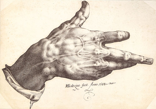 The skill and surety with which Goltzius wielded the engravers burin was a feat made more impressive by fact that as a child he fell into a fire and severely burnt his right hand. As a result his hand was permanently damaged and never able to fully open. However this did not stop him from using it to draw, engrave and paint, and it was this hand that he paid homage to in his remarkable pen drawing of 1588 Goltzius’s right hand, which reveals visual evidence of the trauma it suffered.