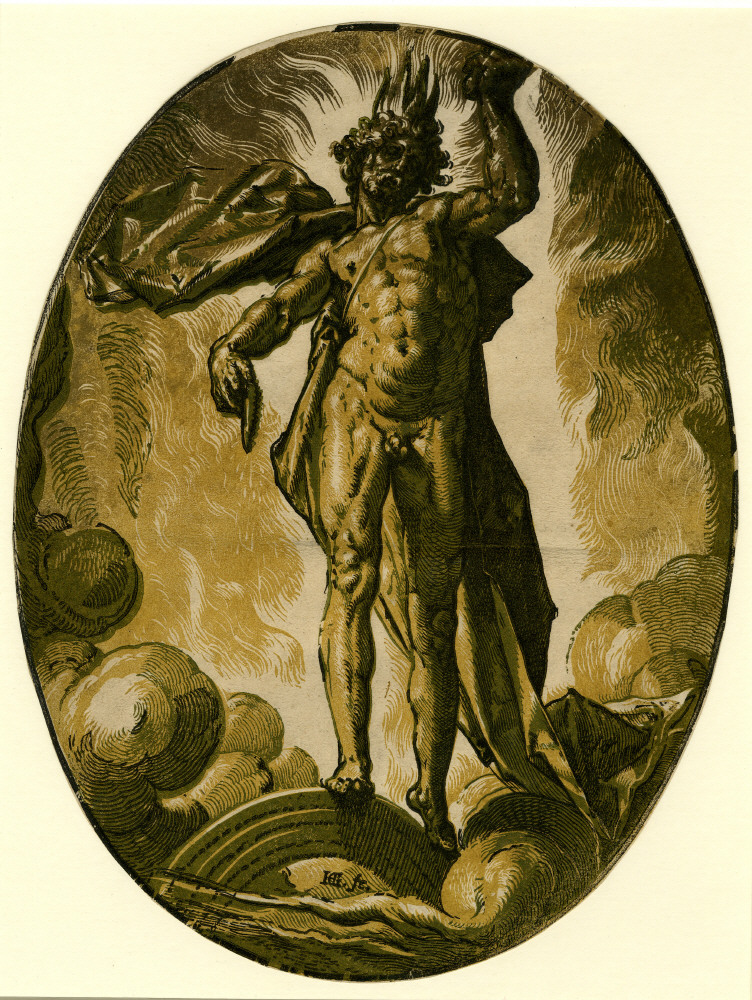 Around the same period Goltzius created another richly mannered series of mythologically inspired fantasies called The Deities of c. 1588-90. For these prints the artist turned his gifted right hand to the chiaroscuro woodcut technique. This involves carving into two or more woodblocks, leaving the areas to be inked and printed standing in relief. Each block is inked with a different colour and individually printed onto the same sheet. The resulting layering of different toned inks can be used to create the effect of light and shade, hence the term chiaroscuro, with the white of the paper often left exposed in areas to act as white highlights.[4] While the Renaissance chronicler Giorgio Vasari compared this technique to drawing with brush and wash heightened by white,[5] it is also known for its capacity to create convincing sculptural qualities. Such qualities are beautifully expressed in The Deities.