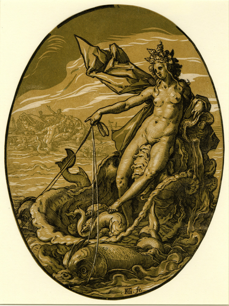 Hendrick Goltzius The Deities, Tethys (c. 1588-90) chiaroscuro woodcut, 346 x 258mm, Museum number: W,5.48 Bibliography: New Hollstein (Dutch & Flemish) 296.IIIa (Hendrick Goltzius); Hirschmann 368; Hollstein 368; Strauss 422 (as Venus Marina); Bartsch III.73.235 To view this print on the British Museum Collection Online click here © The Trustees of the British Museum