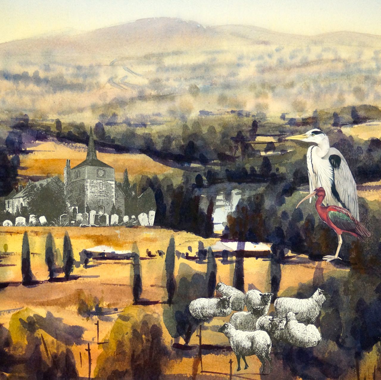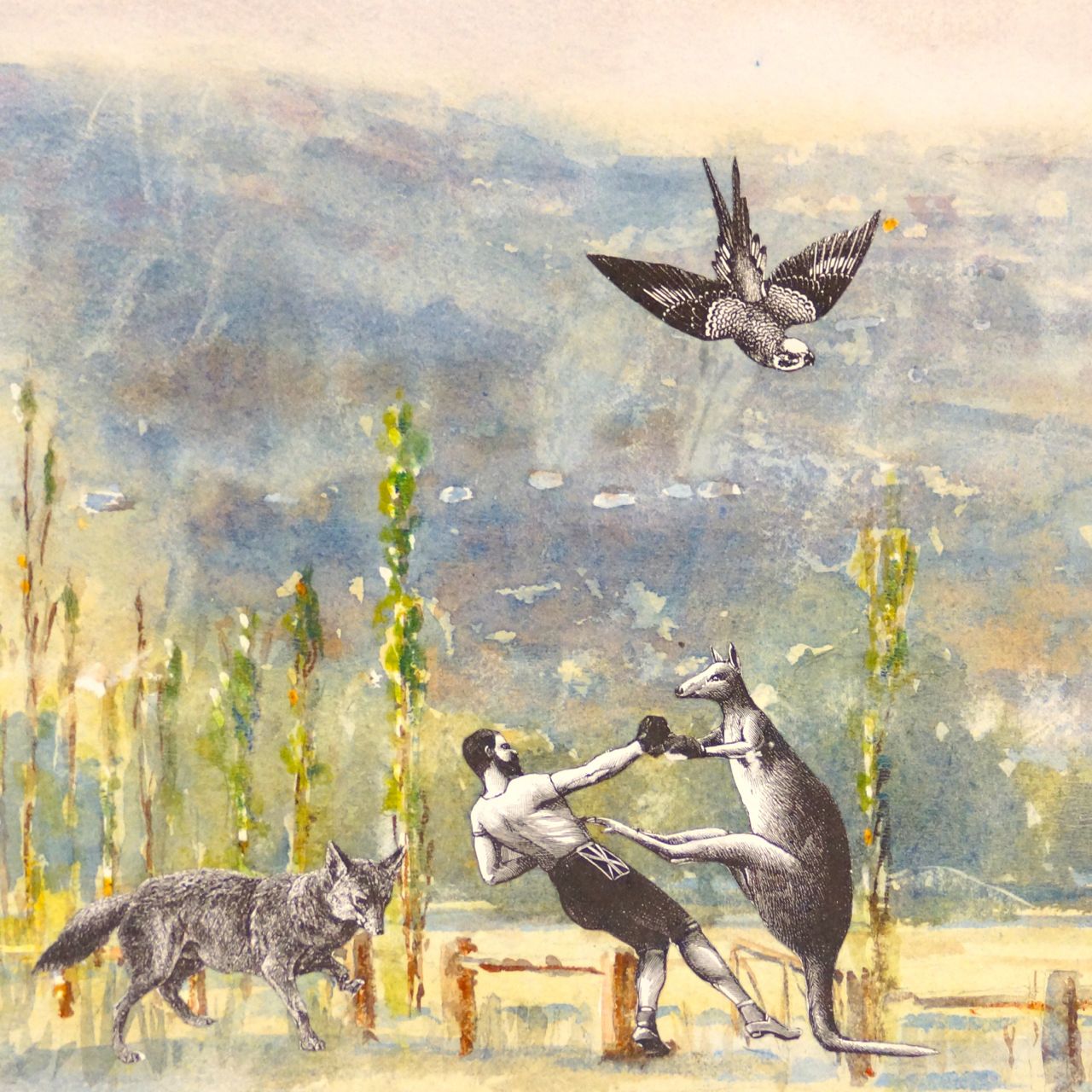 In Juxtaposed, Melbourne based artist Colin Palethorpe considers the Australian landscape as a hybrid space, using the stark nature of collage to evoke an almost alien collision of European ‘settler’ culture on Australian soil. Idyllic pastoral scenes are sensitively rendered on paper, only to be interrupted by foxes, birds, rabbits and various other elements cut out from historic sources, and inserted into the imagery. Out of scale and out of place, they loom larger than life and lend a surreal dimension to the Australian landscape.