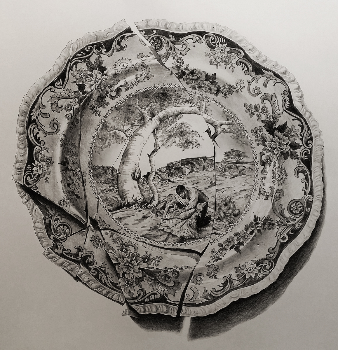 Hague’s most recent series of prints that focus on smashed porcelain plates contain an imaginative figural discourse. In Blue Claude Hague takes a broken plate and depicts in its center a classic Claude Lorrain harbour scene. Frederick McCubbin’s disheartened prospector from the 1855 painting Down on His Luck is inserted into the foreground, contemplating his ill fortune while gazing at a fire. The entire vignette is encircled by a dense floral pattern reminiscent of nineteenth century Wedgwood or Spode porcelain designs.