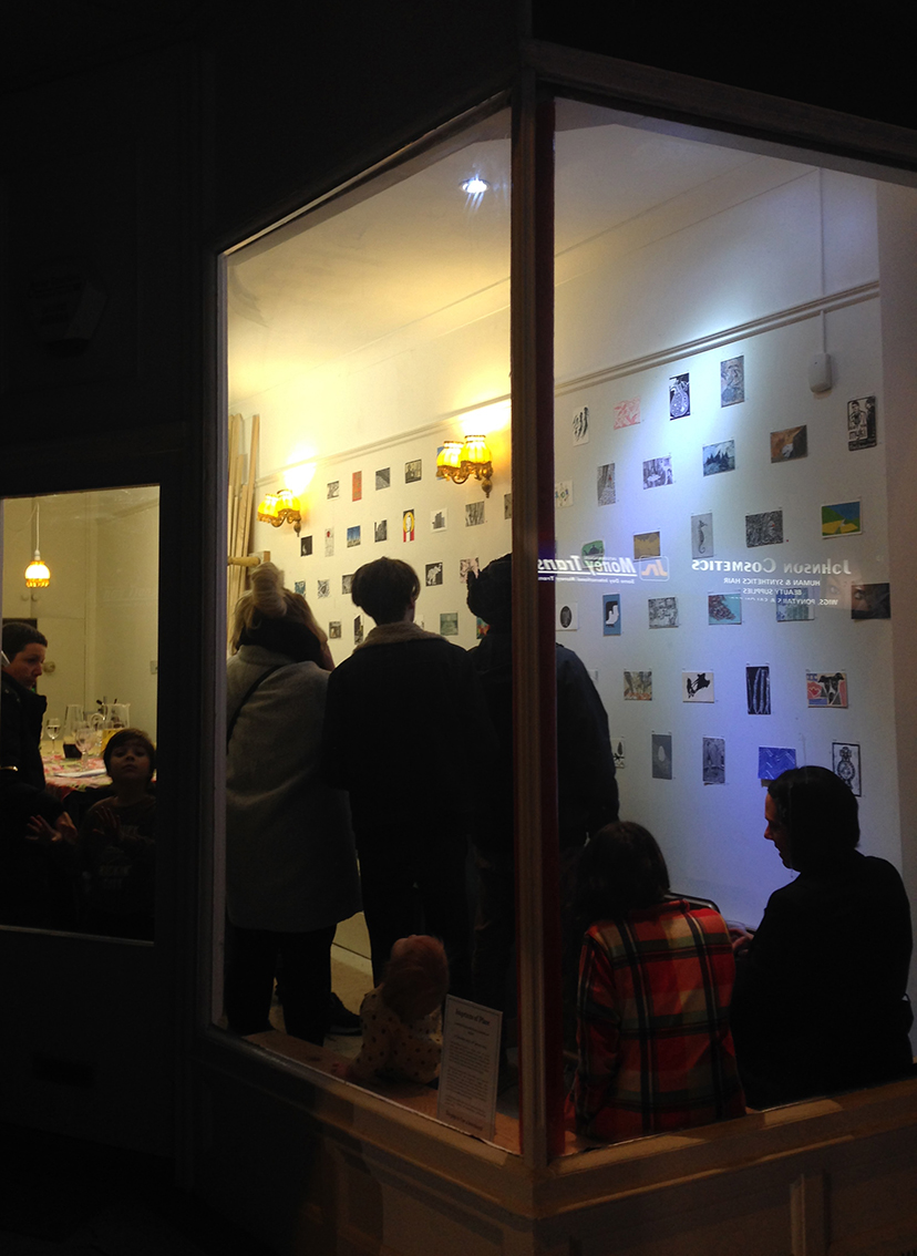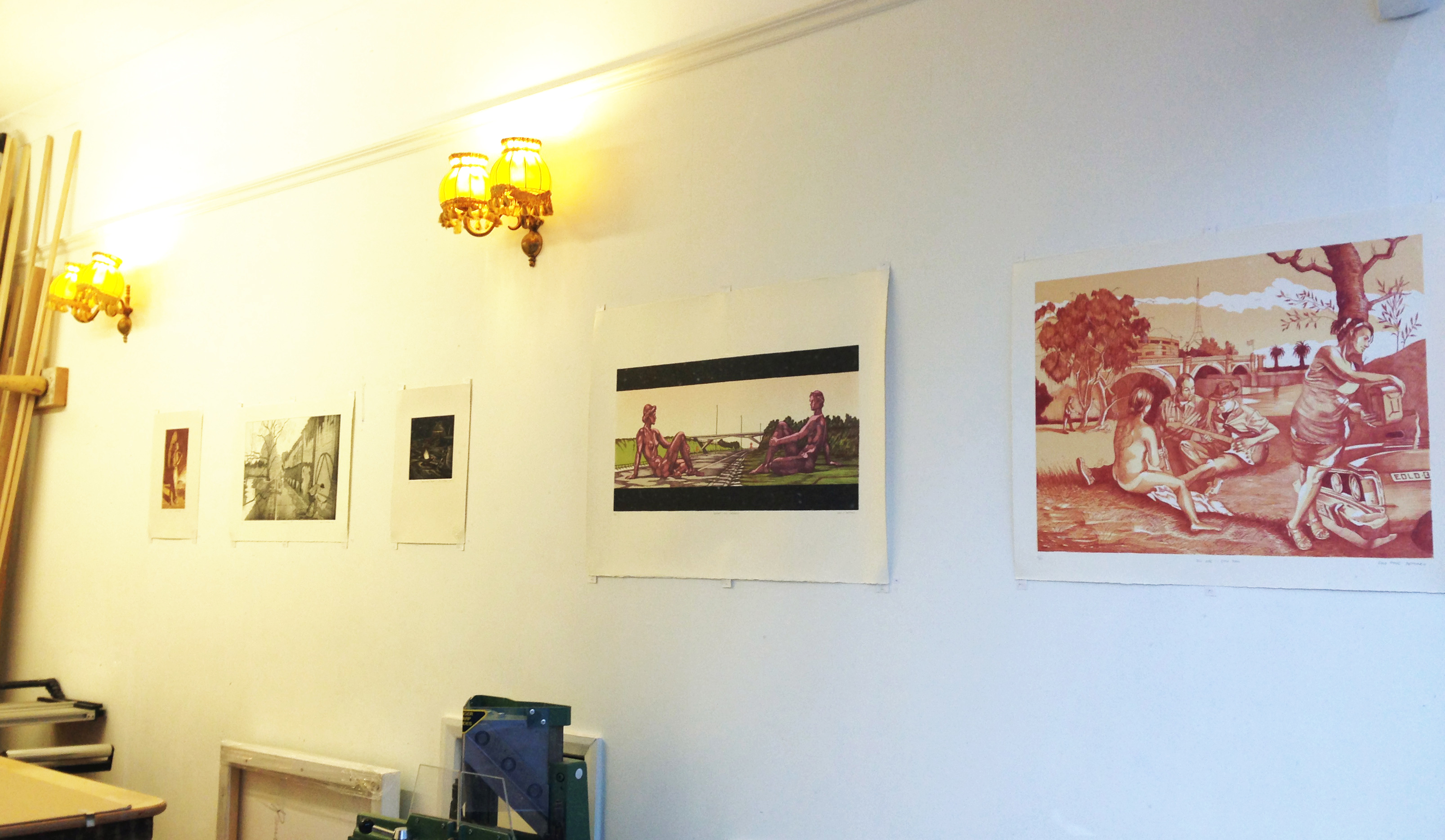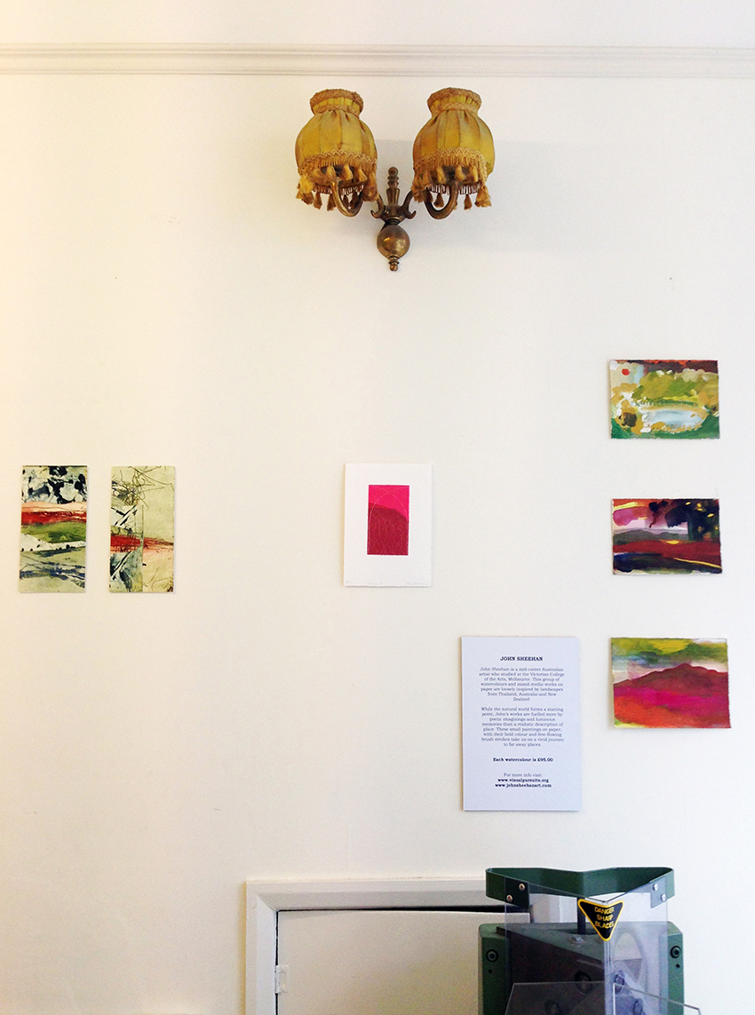 An intimate space with some warm domestic flourishes (note the cute light shades!) The Framing Salon has proved a lovely venue to exhibit small scale works on paper. As a working space it also makes a refreshing change from the ubiquitous white cube, and sets viewers at ease as they encounter the works on display.