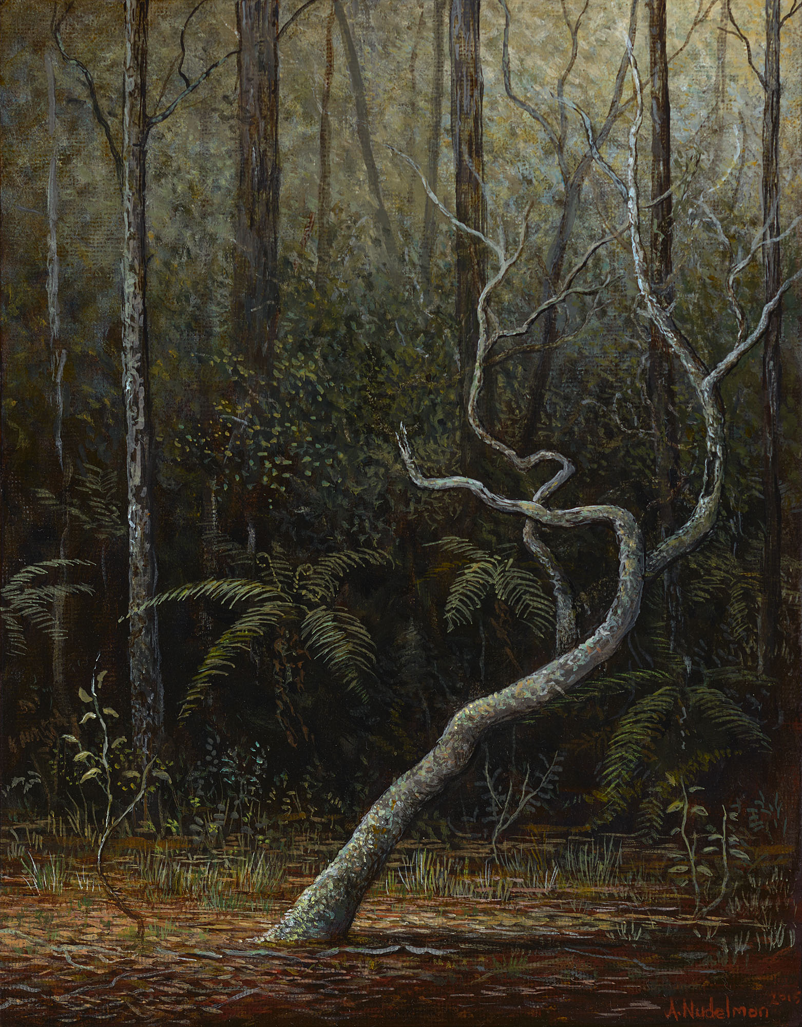 Nudelman’s personal connection to historical European painting techniques and modes of expression has long been an important factor in his work, and is richly expressed in this new exhibition. The artist lives and works from his studio in the hills above Foster in South Gippsland, Victoria, where he paints full-time. For him, the landforms, low grey skies, pockets of dense, dark forest and intense weather of South Gippsland provide a physical and psychological link to the European landscape and experience. These influences can be detected in both the aesthetics and subject of this new series of finely detailed oil paintings, that oscillate between the brooding, dense darkness of forest interiors, and the big skies and vast open spaces for which his work is well known. While these works are undeniably romantic, revealing natures most captivating secrets, they are rendered with the cool breed of refined realism that Nudelman has steadily developed over two decades while depicting Australia’s varied terrain.