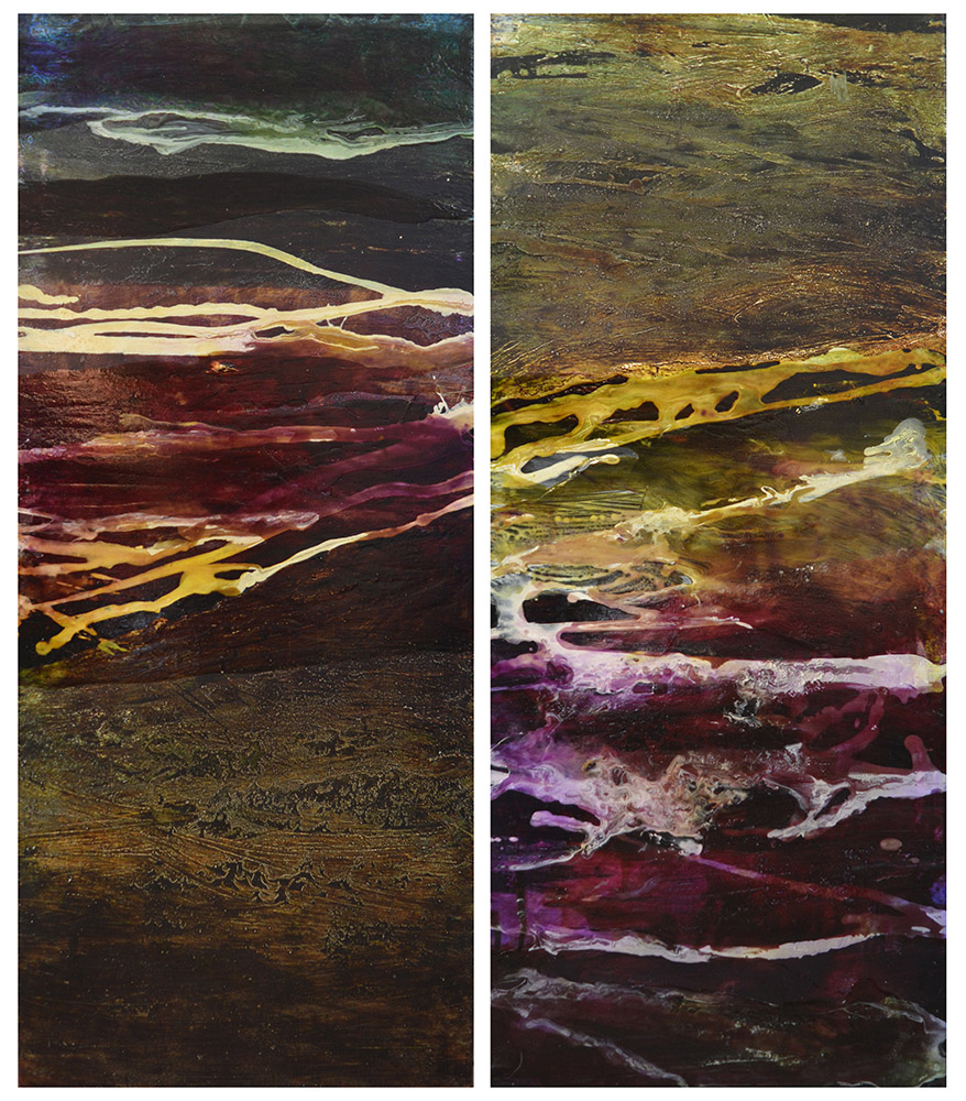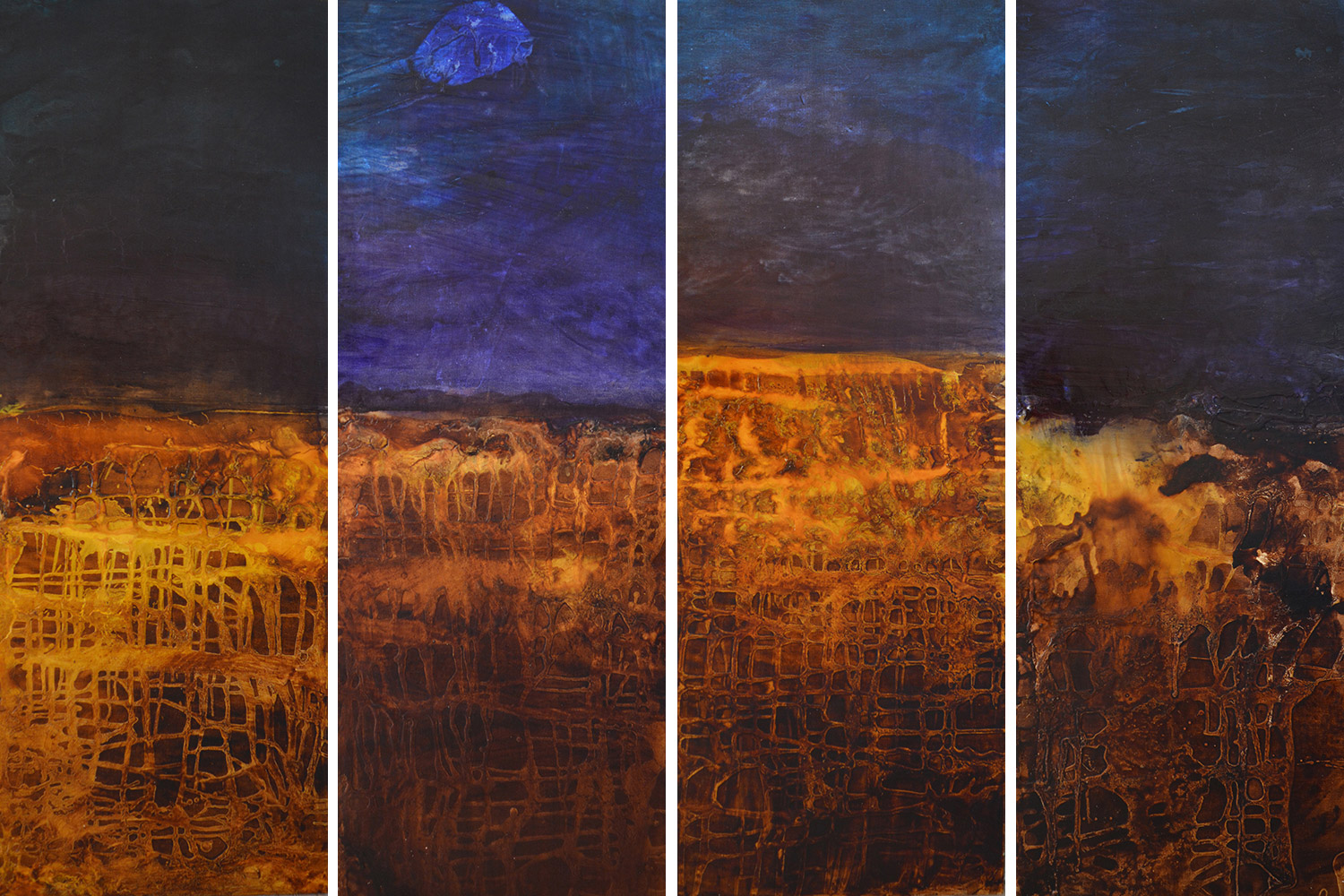 Her layered way of building up the works result in highly textured surfaces. Rich in pentimento, the artist balances areas of density with transparency. The effect in some paintings is almost opalescent, like looking through a crystal and catching flashes of submerged colours and shapes. Forms emerge and recede, and the horizon line rises and falls in panels, unsettling a clear reading of the image. This encourages the viewer to consider each artwork less as a landscape view, more as an object shaped by experiential encounters and elemental forces of nature.