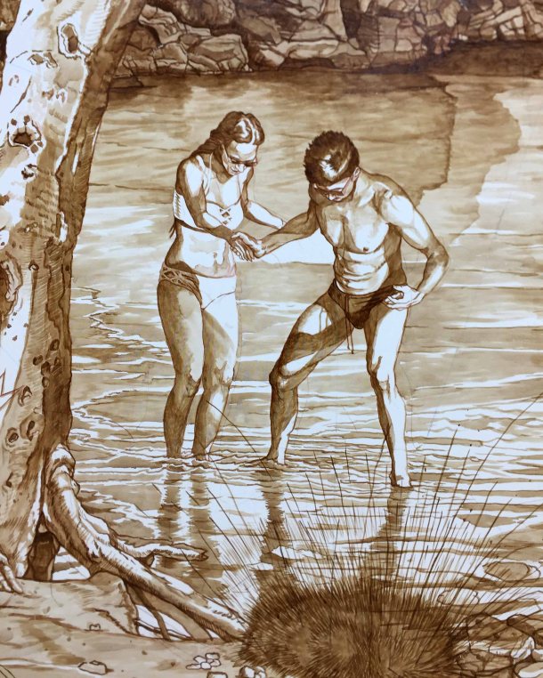 This painting depicts Ellery Creek Big Hole, one of the main waterholes in the West MacDonnell Ranges in central Australia. The Aboriginal name for the waterhole is Udepata, and as a permanent source of water it is an important place for the Arrarnta people. Many visitors come here to swim in its cool waters, and the artist has depicted contemporary figures immersed in an ancient, primordial landscape. His influences in creating this work include the paintings of Albert Namatjira (1902 – 1959), who famously depicted the region. This work was created as a study for a large fresco painting of the same name, commissioned in 2017 for the Australian Events Centre, Essendon Fields, Melbourne.